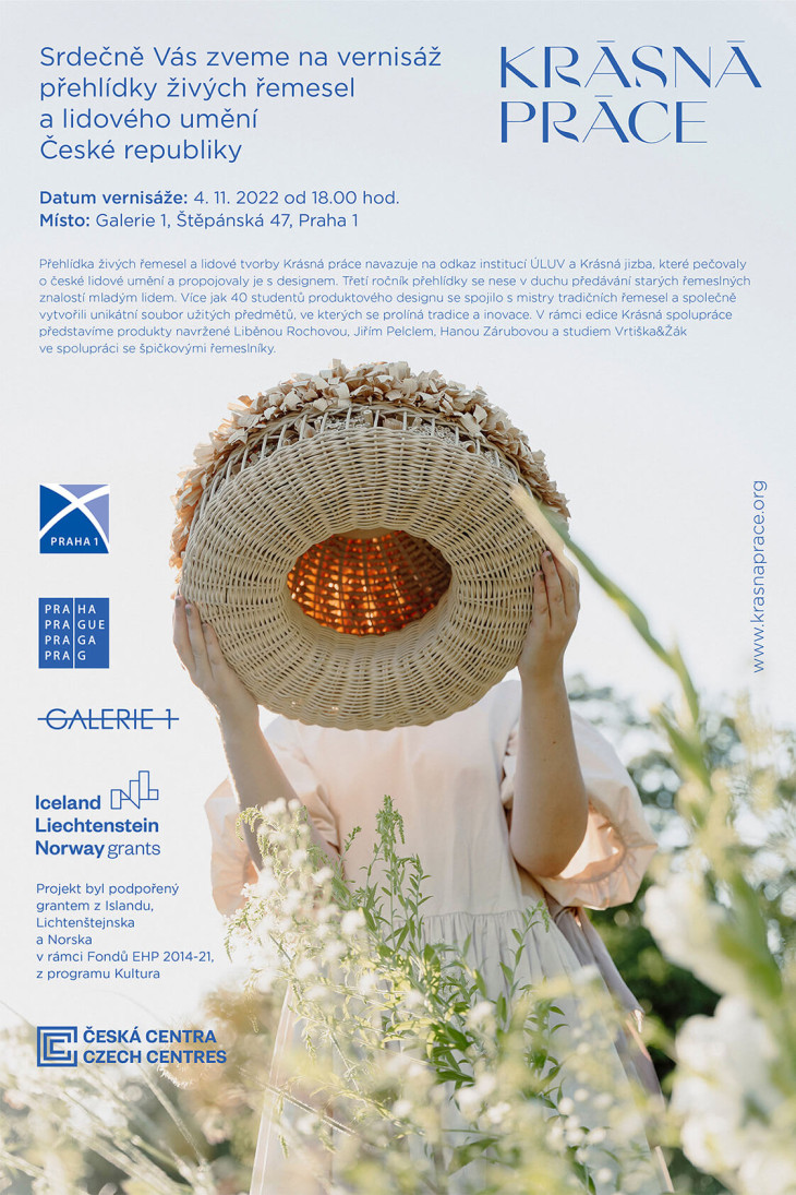 Projekt Krásná práce chystá výstavu věnovanou živým lidovým řemeslům a jejich tvůrcům. Cílem letošní přehlídky je předat starou řemeslnou znalost mladé generaci. Studenti ateliéru produktového designu čtyř vysokých uměleckých škol představí unikátní soubor více než 40 předmětů, které vytvořili společně s mistry tradičních řemesel. Návštěvníci budou moci obdivovat také kolekci, která vznikla v kooperaci špičkových českých řemeslníků s renomovanými českými designéry, jako jsou Liběna Rochová, Jiří Pelcl, Hana Zárubová a studio Vrtiška & Žák. Výstava Krásná práce se uskuteční od 5. do 26. listopadu v pražské Galerii 1, a poté bude díky Českým centrům prezentovat tradici českého řemesla v galeriích po celém světě. Součástí přehlídky jsou workshopy, komentované prohlídky a obchod. Výstava je součástí projektu Fórum Krásná práce – platforma pro posilování aktérů v oblasti tradičních řemesel, jejich síťování a rozvoj interdisciplinární spolupráce, podpořeného grantem z Islandu, Lichtenštejnska a Norska v rámci Fondů EHP 2014-21, z programu Kultura.