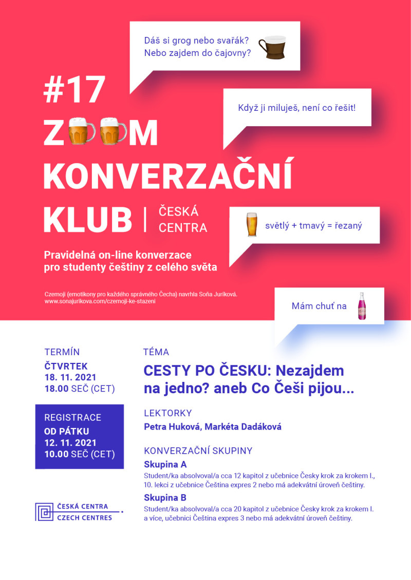 Srdečně zveme na v pořadí už 17. konverzační klub Českých center, tentokrát na téma „CESTY PO ČESKU: Nezajdem na jedno? aneb Co Češi pijou…“ Chcete si zlepšit své dosavadní jazykové znalosti češtiny a zároveň i poznat stejné nadšence i z jiných koutů světa? Česká centra přináší pravidelnou online konverzaci pro své studenty kurzů češtiny z celého světa. 16. setkání se bude konat ve středu 20. 10. 2021 od 18:00 na platformě Zoom.